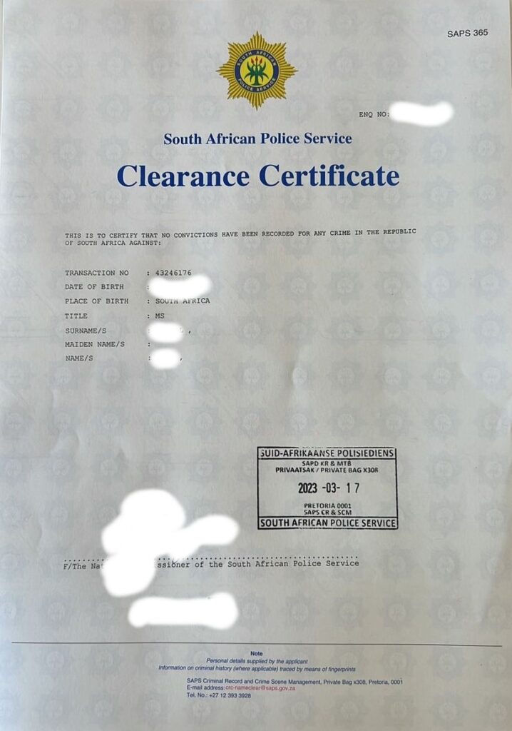 Police Clearance Certificates contains various numbers, all which are important only to SAPS, such as a enquiry number, transaction number and SAPS number which may be used to do an online inquiry if you wish to know the process stage of your police clearance certificate. The yellow-gold and blue SAPS logo and heading are centered at the top, and the person’s details are below. There is no South African ID number or passport number listed on any South African police clearance. It is important to make very sure, as soon as you have received your PCC or seen a scan thereof, to check all the details carefully as mistakes do occur.